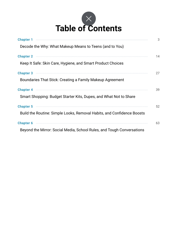 Makeup, Teens, and Boundaries gives you calm, practical guidance to handle these moments with confidence. This e-book helps you understand your teen’s perspective, set clear and respectful boundaries, and build trust—so makeup becomes a conversation, not a conflict.